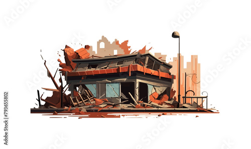 Vector illustration depicting a demolition site where a large yellow excavator is tearing down a ruined concrete building, symbolizing construction, destruction, deconstruction, and urban renewal proj