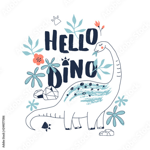 Cute dino print with text. Poster with abstract little dinosaur and plants. Scandinavian print with baby dino and lettering.
