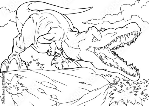 Tyrannosaurus rex ( T-rex ) is walking and snarling . Silhouette design . Set of various dinosaur posture . Vector .