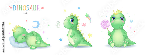 Draw vector illustration character collection baby dinosaur Dino for kids Watercolor style