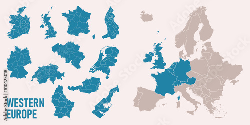 Western Europe map. Germany, Netherland, Belgium, Luxemburg, Austria, Switzerland, France, Monaco, Lieehtenstein, Ireland, Great Britain maps with regions. Europe map isolated on white background.