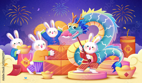 A cute white rabbit celebrates 2026 with firecrackers and fireworks outdoors.