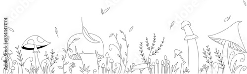 Hand drawn border with mushrooms and ferns for nature inspired designs