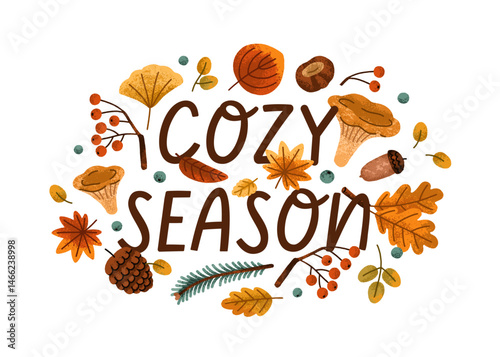 Seamless pattern with autumn foliage, cozy scarves, hot mugs, and forest mushrooms