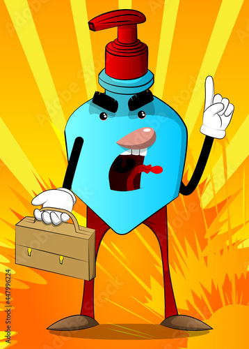 Cartoon bottle of hand sanitizer gel for hygiene with face holding suitcase and making a point.