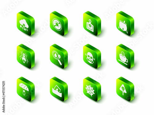 Set Stop colorado beetle, Bottle with potion, Witch cauldron, Coffee cup skull, Bones and, Gas mask, Bacteria and Radioactive waste in barrel icon. Vector