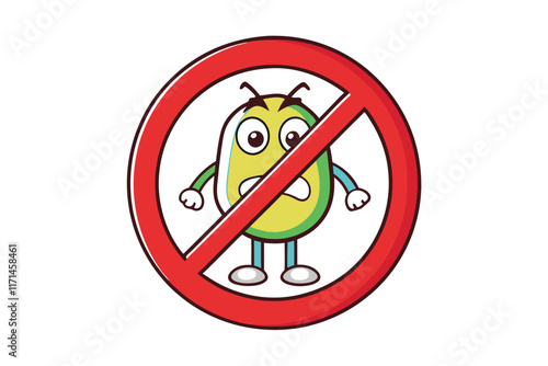 Cartoon illustration of prohibited bacteria icon, featuring colorful germ character inside a red no entry symbol on white background