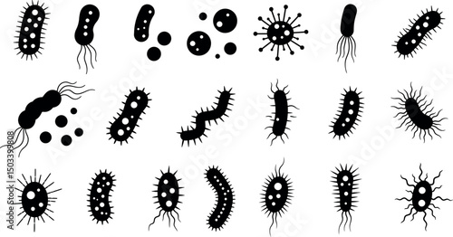 Collection of diverse black bacteria silhouettes on white background