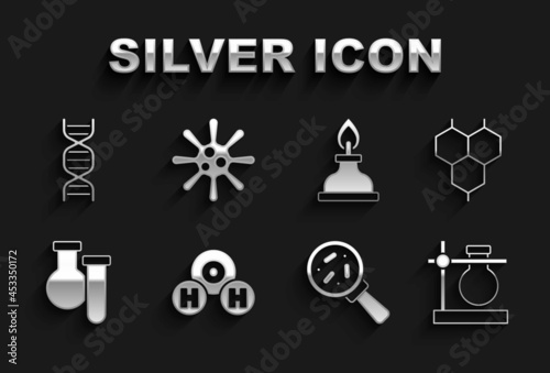 Set Chemical formula for H2O, Test tube flask on stand, Microorganisms under magnifier, Alcohol spirit burner, DNA symbol and Bacteria icon. Vector