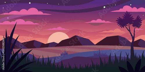 Dusk over grasslands landscape with mountains and setting sun in distance
