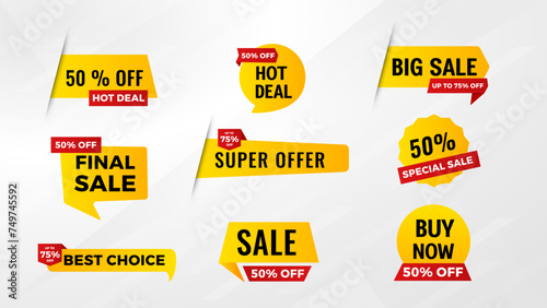 Colorful sale stickers featuring half price and limited offer messages for promotional marketing campaigns and retail advertising to attract customers and boost sales effectively