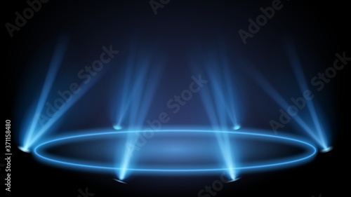 Set of spotlight shines on the stage, scene, podium. Bright lighting with spotlights. Spot lighting of the stage. Lens flash light effect from a lamp or spot.