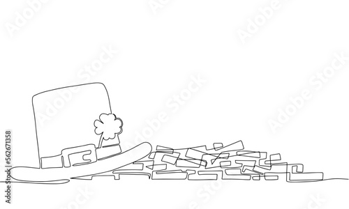 Leprechaun hat with gold coins. Line art banner for Saint Patrick Day. One continues line. Vector illustration. Hand draw vector illustraiton.