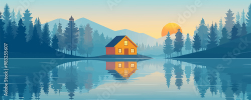 Serene lakeside cabin retreat illustration at colorful sunset nature scene