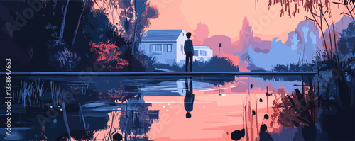 serene lakeside silhouette: a man contemplating at sunset, isolated on a transparent background – vector illustration