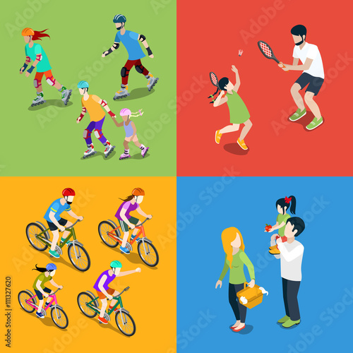 Family urban young people parents parenting outdoor sports flat 3d isometric isometry web infographic concept vector icon set. Roller rolling skating tennis cycling picnic. Creative people collection.