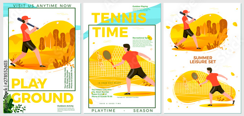 Vector summer sport posters set - cricket and tennis players. Forests, trees and hills on background. Print template with place for your text.