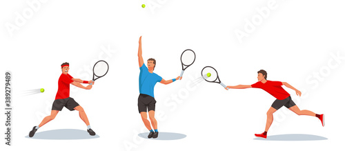 Set of tennis players holding a tennis racket and serving a ball. The athlete follows the flight of a ball with his eyes. Vector flat design character illustration