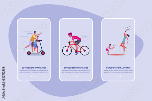 Outdoor sport activities set. People playing tennis, jogging, riding bike, scooter in city park. Flat vector illustrations. Lifestyle, sport concept for banner, website design or landing web page