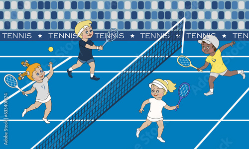 Mixed doubles tennis. One boy and one girl per team playing on tennis court. Cartoon vector illustration. Sport.