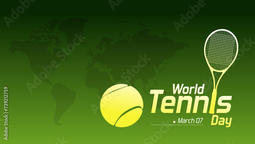 World Tennis Day background template with world map, tennis ball, and racket, in green color scheme. Celebrated every March 7th. Sports vector illustration in trendy style. Editable graphic resources.