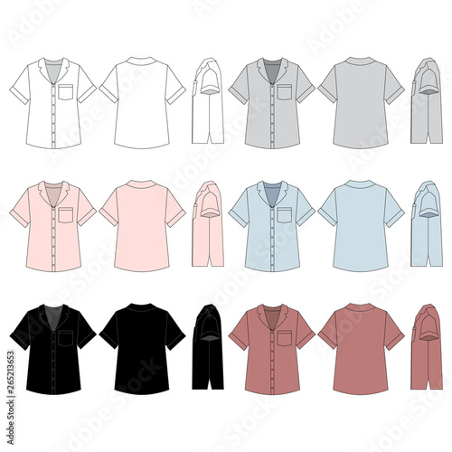 Short sleeve sleepwear shirt and shorts, fashion flat sketch, women’s loungewear design template, vector illustration for apparel industry