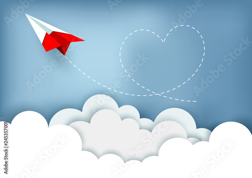 concept of business success, paper plane red flying on sky while flying above a cloud. beautiful natural landscape. to the target. startup. creative idea.  illustration cartoon vector