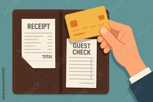 Customer paying for meal with credit card at restaurant. Bill folder with receipt and guest check. Concept of cashless payment, dining expenses, hospitality service, financial transaction.