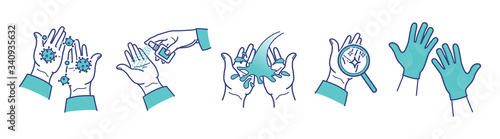 Hand Hygiene Icons. Line style icons of hand hygiene: handwashing with soap, sanitizer bottle, rubbing hands icon, water tap with