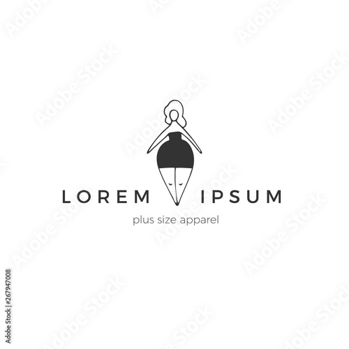 Happy overweight attractive woman. Vector hand drawn logo template. Body positive, plus size concept.