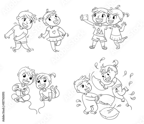 Kids reading on a huge pile of books. School education and knowledge concept. Vector Illustration, clip art, cartoon, drawing, Coloring Book, black and white, outline.