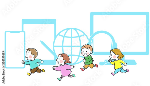 Silhouette of children using smartphones, digital addiction concept, modern technology generation, screen time, kids online communication, mobile device illustration