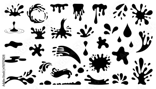 Black paint splatter set isolated on white background. Water splash silhouette vector texture overlay.