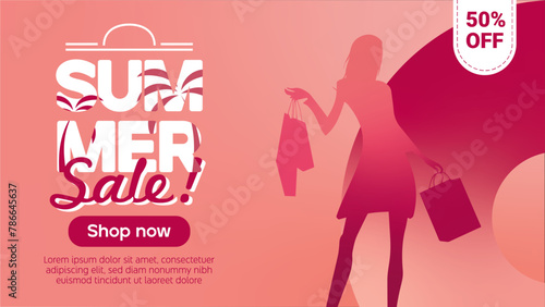 Illustration of a Young Woman Wearing Jeans Carrying a Blank Shopping Bag Isolated on Pink Background. Template Mockup for Retail Holiday Sales, Black Friday and Holiday Season Promotion