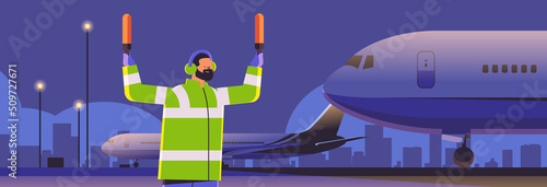 Takeoff of an airplane and an airport in background. Air transport navigation, aircraft innovation, travel concept, futuristic tech, aviation technology, AI in aviation, night flight, cargo journey