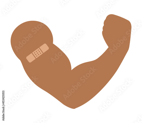 Black person arm breaks through green paper shows adhesive bandage after vaccination making thumb up gesture vaccine booster positive concept