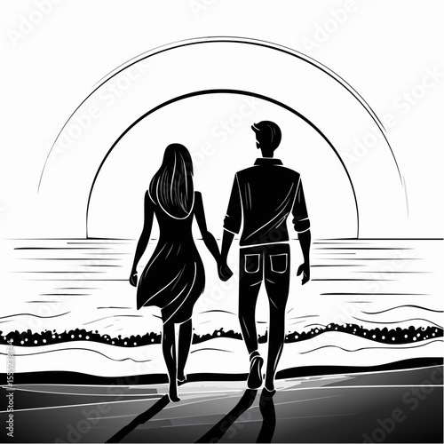 Romantic Couple Walking on the Beach from Behind, Hand in Hand, Enjoying the Sunset View silhouette vector