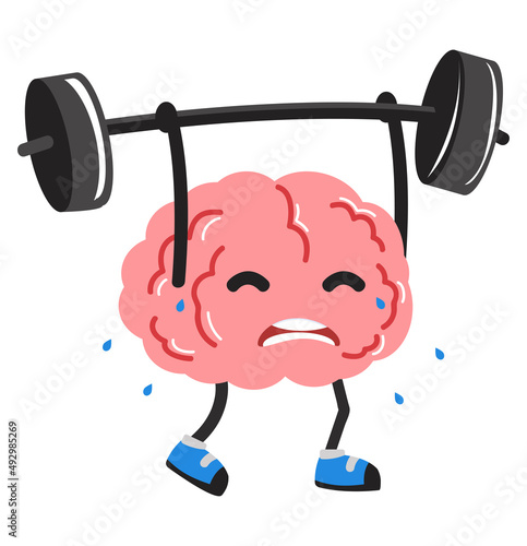 Cute strong brain character lifting up weight barbell for brain training exercise concept