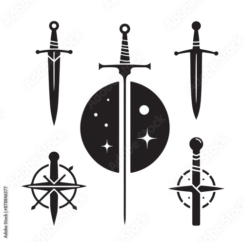 Sword Icons Dagger Blade Broadsword Fantasy Shield Combat Weapon Silhouette Shape Black Vector Set