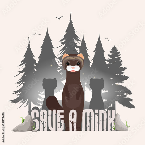 Save the mink banner. Mink, forest silhouette. Animal conservation concept. Vector.