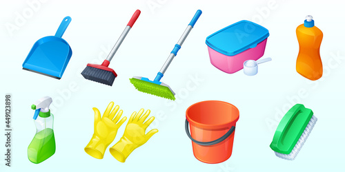 House cleaning tools. Washing and cleaning equipment, rubber gloves, dustpan and brush, soap bottle and bucket. Vector housekeeping chemical set