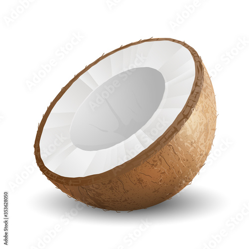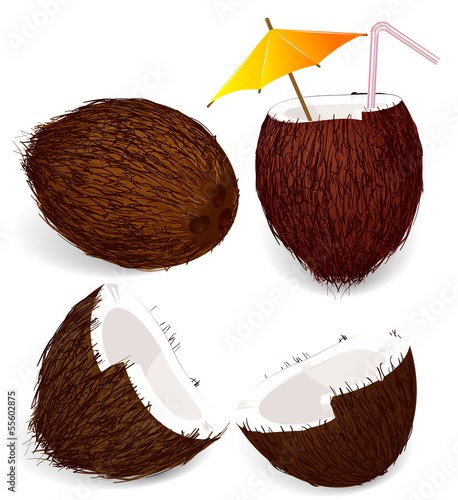 Coconut illustration. A whole coconut and a half isolated on white background. Useful natural product