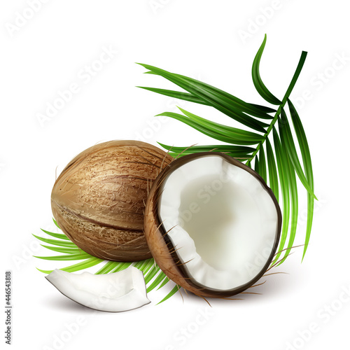 3 d. Ripe and Green Coconut with white flesh and palm leaves on a white background. Splash of coconut milk.Vector illustration.