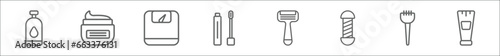 outline set of beauty line icons. linear vector icons such as inclined bottle, facial cream, big scale, liquid makeup, disposable razor, barber shop, tint brush, cream