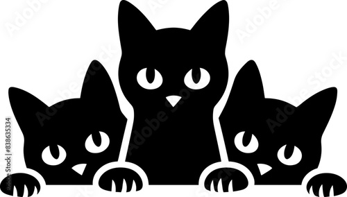 Twelve distinct black cat silhouettes stand, sit, crawl, and prowl against the white background