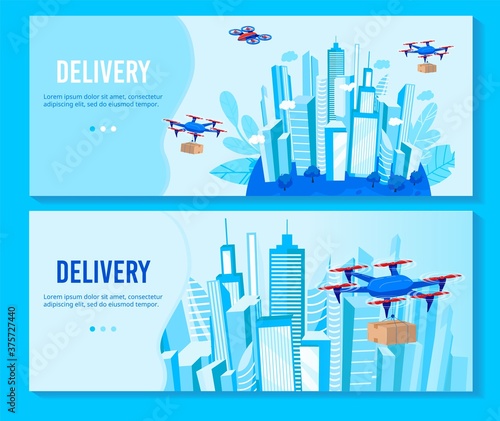 Drone delivery vector illustration set. Cartoon flat delivering service banners with drone transportation, quadcopter transport shipping boxes, flying over modern city, futuristic aerial shipment
