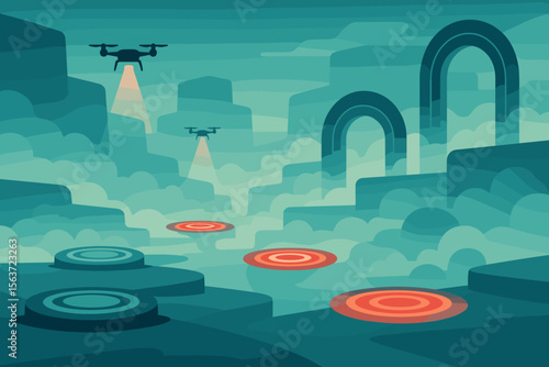 Futuristic drone-lit canyon with glowing red platforms and echo arches