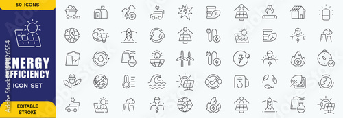 Set of 50 line icons related to energy, electrical energy, electricity. Outline icon collection. Vector illustration. Editable stroke
