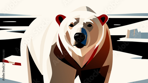 Polar bear stands alone on melting ice floe in stark arctic landscape Powerful environmental statement with geometric styling Concept climate activism, environmental education, conservation fundraisin