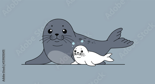 Adorable mother and baby harp seals enjoying a peaceful day together on the ice floe